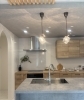グレーと木の優しいカラーが特長で、ナチュラルな雰囲気のキッチンスペースになっています。