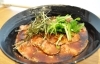 ドーン!と来ましたローストビーフ丼! 隙間なく敷き詰めたお肉でご飯が見えません! さながらお肉のフタ状態ですね。