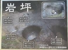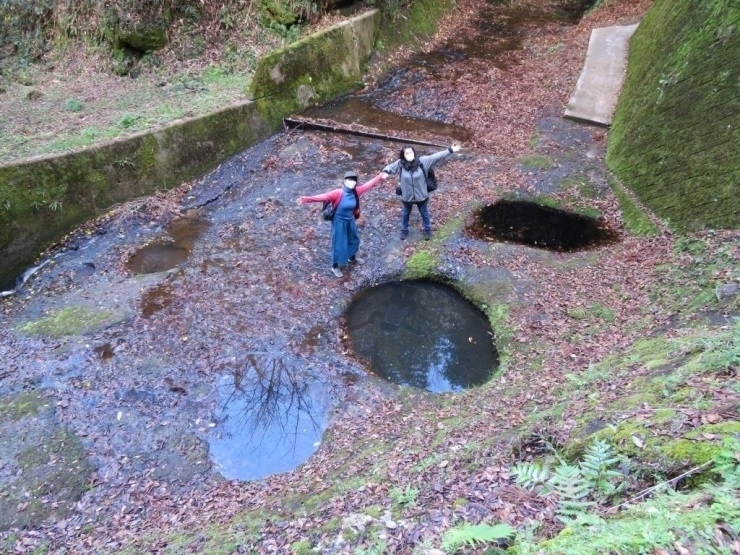 水の流れによる浸食でできた岩坪は、平坦な岩盤河床に大小5基の穴が並び、穴の大きさは最大直径約2.5m、深さ約1.4mとか。