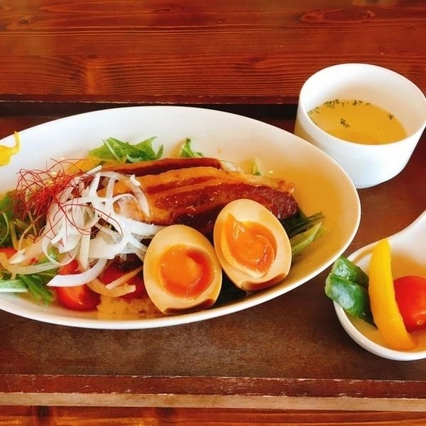 オーシャンビューでのランチ。おすすめはいちじくを使用した柔らかくて甘めの豚の角煮メニューです。角煮丼、角煮のクリームパスタ、角煮うどん、角煮のドリアなど角煮バリエーションが豊富です。(写真は角煮丼)