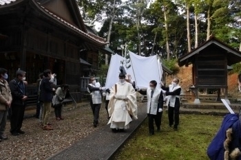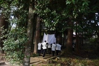 鳥居の外で神様をお迎えになられた宮司と総代は、神籬を白い布で囲み、杉林の参道を抜け境内をぐるりと廻り、10日間を過ごされる十九社へ遷されます。