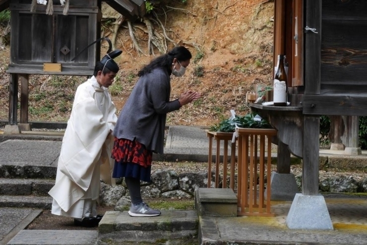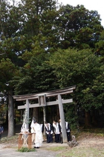 また、宇比多伎山は風土記に「大神の御屋」とあり、古来より信仰を集めていたようです。休日に神迎祭が重なることは滅多にないため、到着した頃には境内は100人ほどの参拝者とメディアであふれていました。神事は先ず、拝殿でお祓いを終えられた宮司と神籬を携えた総代達が、境内から鳥居の前に設えられた祭壇まで向かわれ、参拝者がそれに続きます。