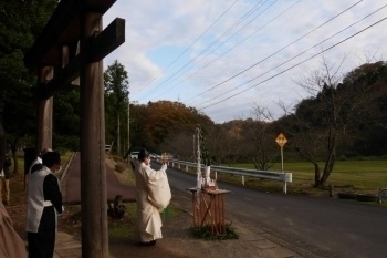 神送祭が行われたのは11月24日、もうじき師走を迎えるとは思えない小春日和の午後でした。15時30分、境内での宮司さんのお祓いから神事が始まりました。神様が過ごされた十九社での祝詞、玉串拝礼と続き、神饌が下げられます。